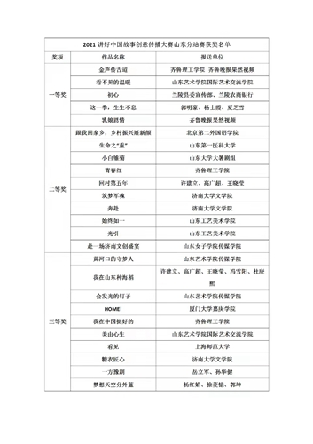 山东分站赛历时近4个月,共征集各类视频作品400余件,经过初筛、初评和终评3个工作环节,按照《中国好故事评价指标体系》确定的标准进行专家评审,25件作品脱颖而出。其中,我校拍摄制作的《金声传古道》《这一拳,生生不息》荣获一等奖并被推荐参与全国总评审,网络投票进入排名前十;《青春红》荣获二等奖;《我在中国挺好的》荣获三等奖。